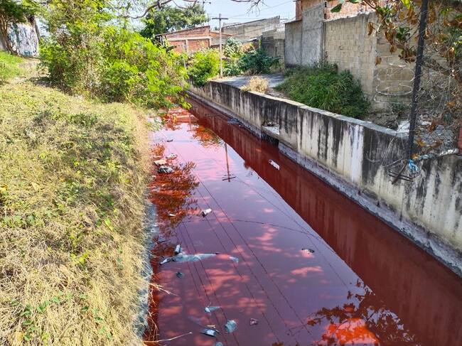 Caracol Radio llegó hasta la zona aledaña al antiguo peaje de Ceballos donde se encuentra el canal y evidenció que la mancha roja continúa con un fuerte olor a sustancia química.