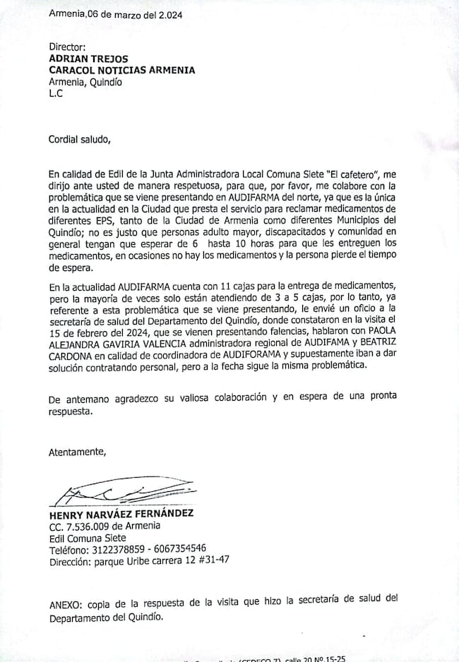 Y es que reiteradas son las quejas ciudadanas por la situación con Audifarma respecto a las demoras en la entrega de los medicamentos donde son largas filas para acceder al servicio. El secretario de Salud del departamento, Carlos Alberto Gómez reconoció la problemática puesto que no solo se ha registrado la situación en Armenia sino en varios municipios afectando la prestación de servicios de los usuarios.