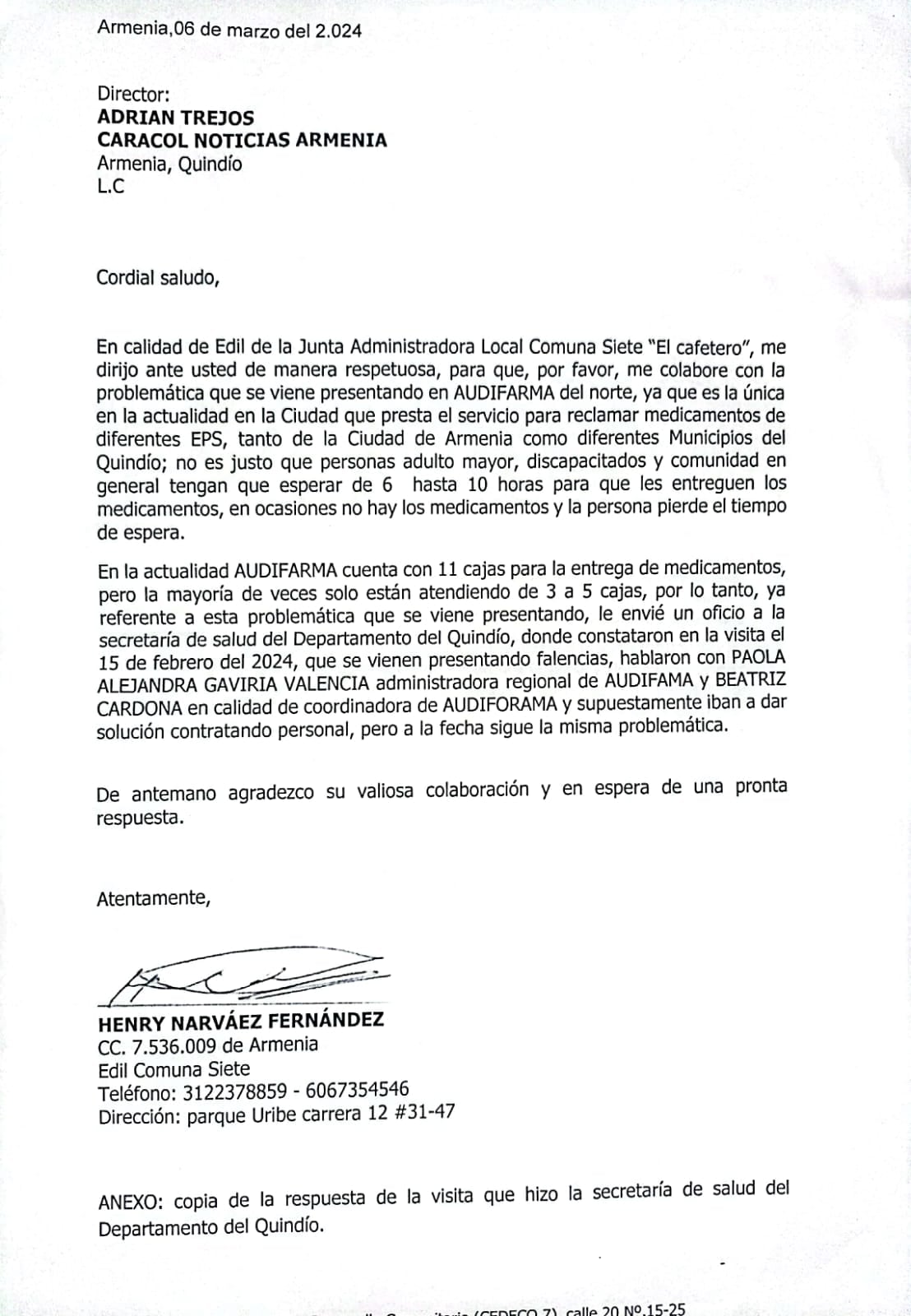 Y es que reiteradas son las quejas ciudadanas por la situación con Audifarma respecto a las demoras en la entrega de los medicamentos donde son largas filas para acceder al servicio. El secretario de Salud del departamento, Carlos Alberto Gómez reconoció la problemática puesto que no solo se ha registrado la situación en Armenia sino en varios municipios afectando la prestación de servicios de los usuarios.