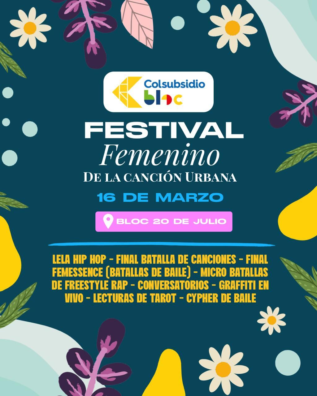 El próximo 16 de marzo se llevará a cabo la primera edición del Festival Femenino de la Canción Urbana en el BLOC de Colsubsidio del barrio 20 de julio, en Bogotá.