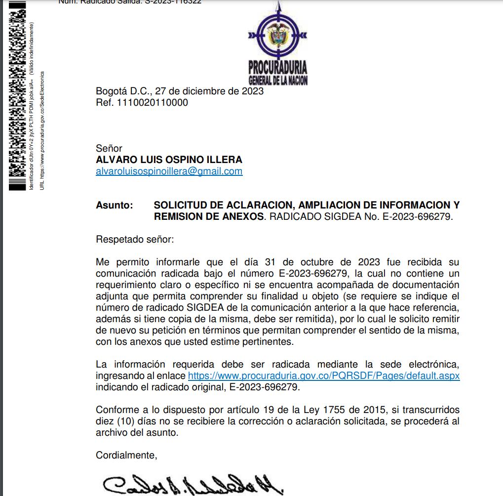 El ministerio Público le dijo que debe ser más preciso porque su requerimiento no es claro y no aportó pruebas, que una vez cuente con los elementos los remita a través del correo dispuesto para peticiones, quejas y reclamos ((VER DOCUMENTO))