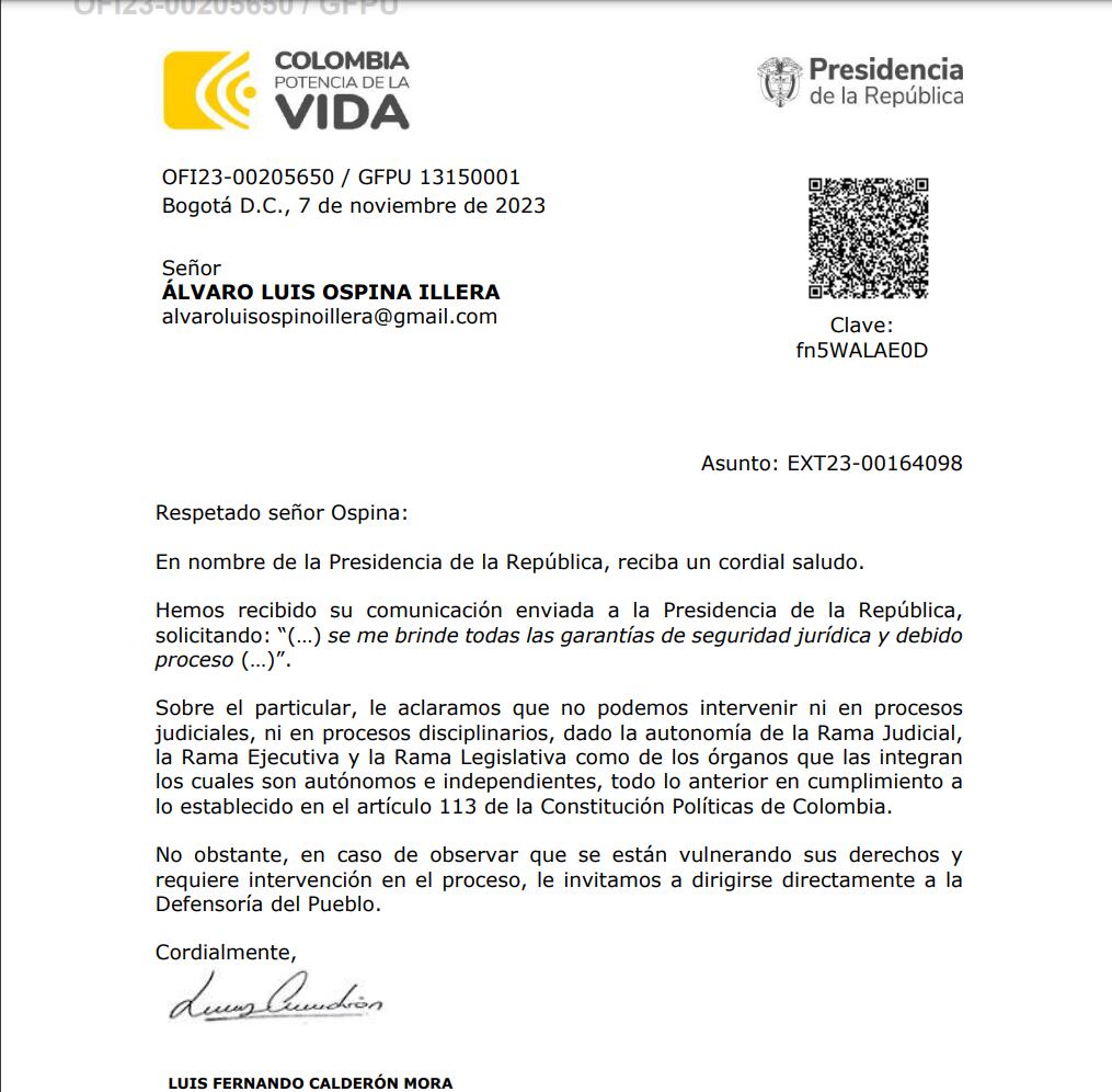 La Presidencia de la República ya le respondió, y le dijo que el gobierno no puede intervenir en procesos judiciales, ni en procesos disciplinarios, dado la autonomía de la Rama Judicial.