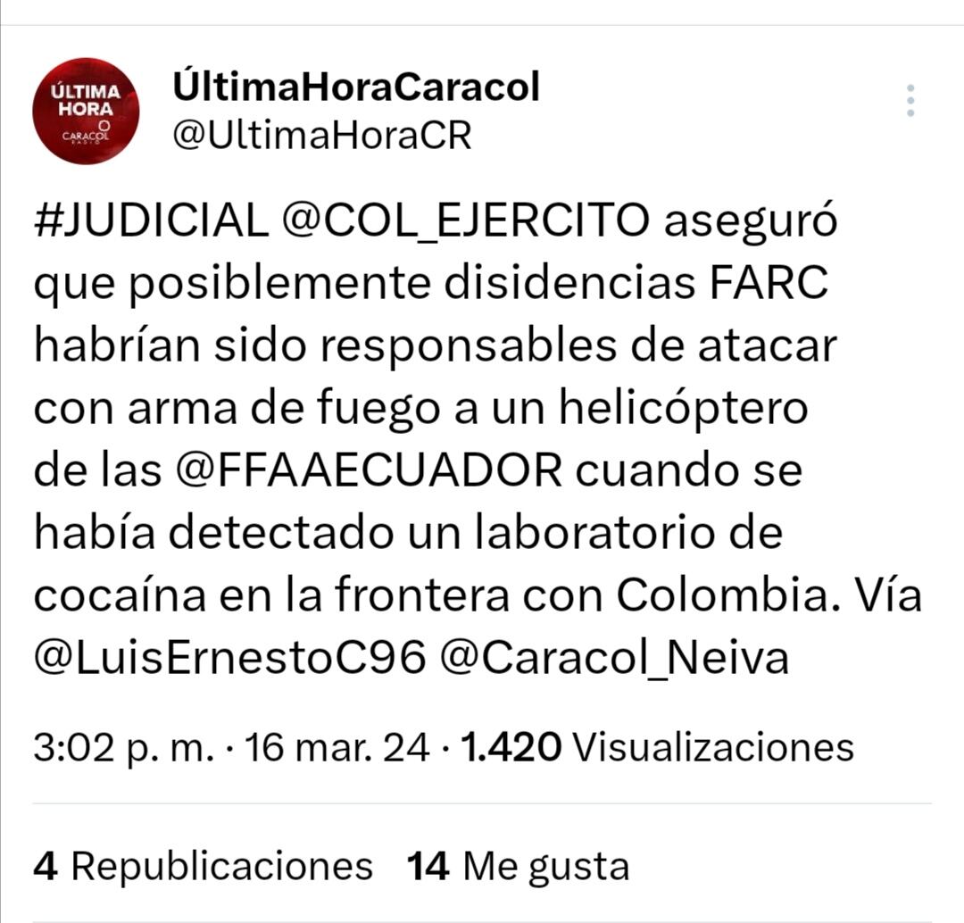 El Ejército Nacional informó que las disidencias de las FARC serían las responsables del reciente ataque a un helicóptero de las Fuerzas Armadas del Ecuador en la frontera con Colombia.
