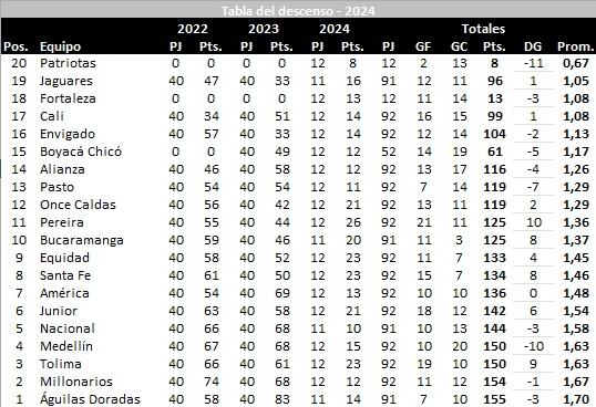 Para el 2024, los dos equipos que ascendieron fueron Patriotas y Fortaleza, clubes que tendrán su conteo de promedio solamente por lo que hagan durante el 2024. Es por eso que el conjunto bogotano, al comenzar ganando sus dos primeros juegos y, a pesar de perder el tercero con Deportivo Cali, se encuentra en la primera posición, es decir, más lejos de los puestos 19 y 20, que serán los que sentencien a aquellos que pierdan la categoría.
