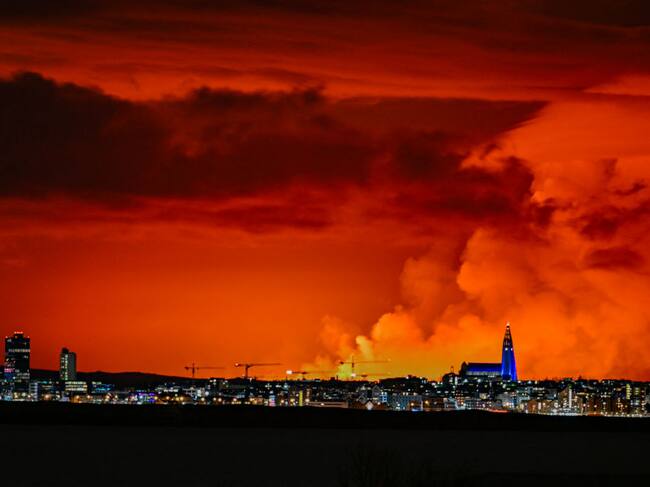 El horizonte de Reykjavik tiene como telón de fondo un cielo de color naranja debido a la lava fundida que fluye desde una fisura en la península de Reykjanes al norte de la ciudad evacuada de Grindavik, al oeste de Islandia, el 16 de marzo de 2024. Lava arrojada el sábado desde un nuevo volcán fisura en la península de Reykjanes en Islandia- (Foto de Halldor KOLBEINS/AFP) (Foto de HALLDOR KOLBEINS/AFP vía Getty Images) / HALLDOR KOLBEINS