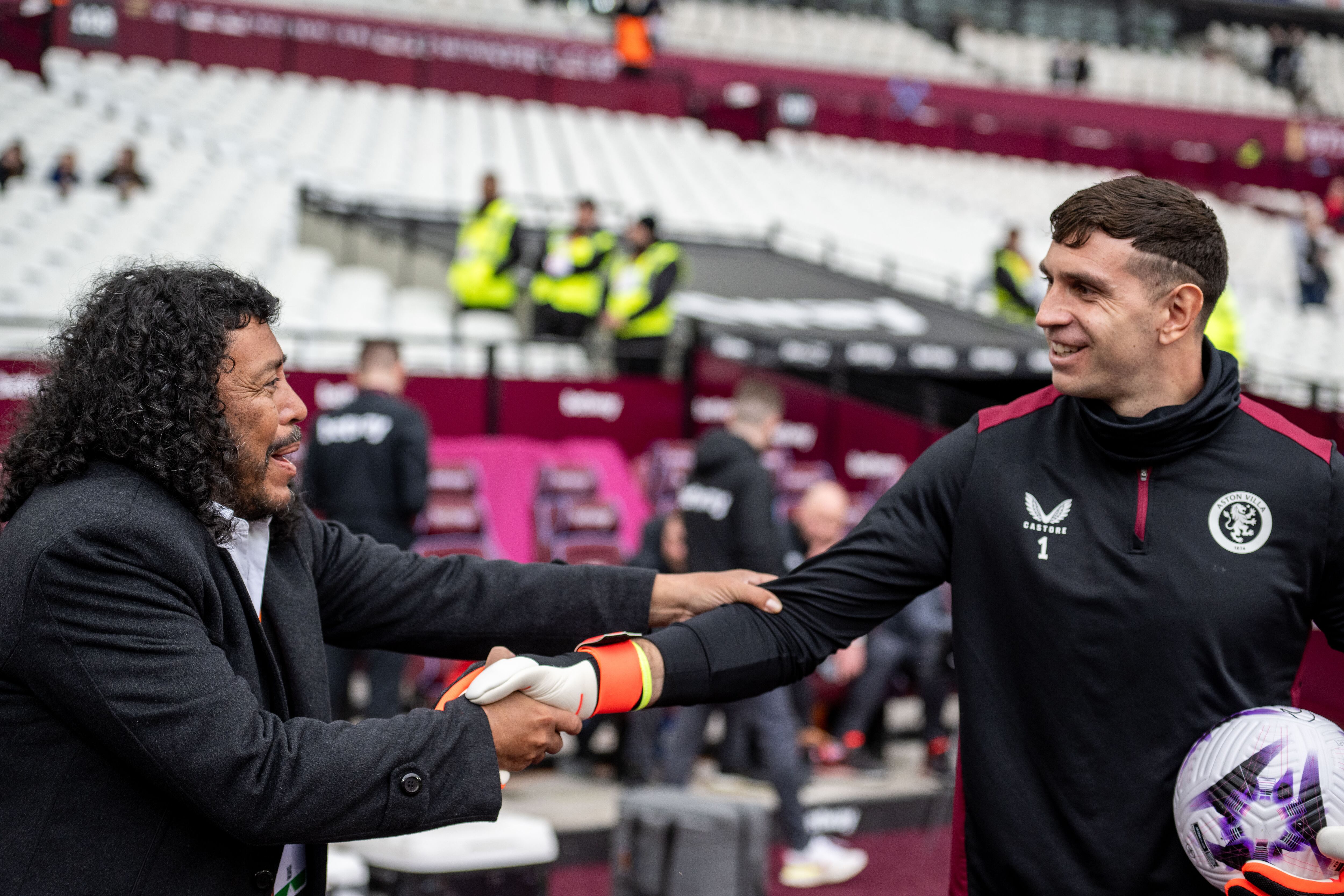 El exportero de la Selección Colombia se reunió con el arquero argentino campeón del mundo antes del partido West Ham-Aston Villa.