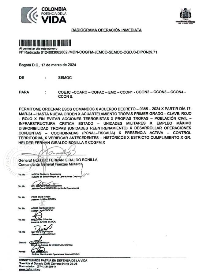 Justamente, desde el domingo pasado, cuando el presidente Petro ordenó suspender el cese al fuego con la disidencia de ‘Iván Mordisco’, las Fuerzas Militares entraron en acuartelamiento de primer grado con el fin de evitar ataques terroristas contra las tropas, población civil, infraestructura crítica del Estado y unidades militares.