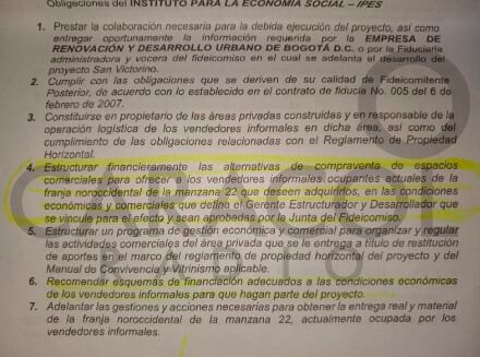 Documento suministrado por los vendedores informales que se compartió durante la socialización de la quinta modificación al convenio 1725 del 2007