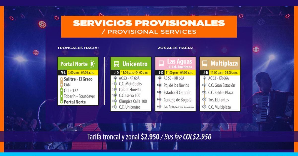 Así las cosas, quienes asistan al festival contarán con tres rutas zonales adicionales que prestarán su servicio entre las 11 de la noche y las 4 de la mañana, saliendo de la Carrera 60 entre el Parque y la Biblioteca Virgilio Barco, con las siguientes rutas: