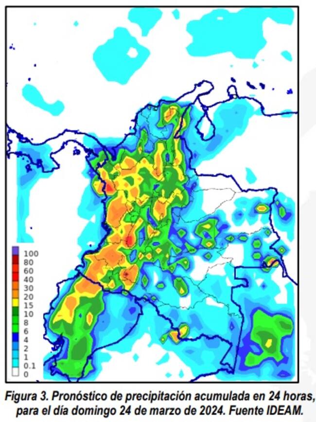 En su comunicado sobre el clima de este fin de semana, del 23 al 25 de marzo, El Instituto de Hidrología, Meteorología y Estudios Ambientales señaló que los mayores volúmenes de precipitación con posibles descargas eléctricas se advierten en el centro y sur de la región Pacífica, norte y centro de la Andina, así como en gran parte de la Amazonia.