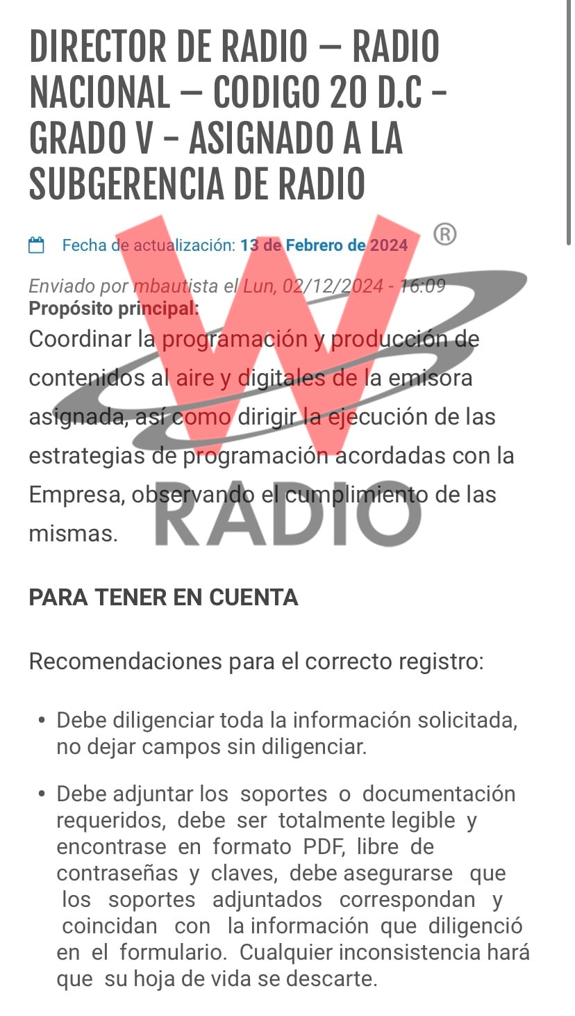 De hecho, hace pocas semanas se abrió la convocatoria para suplir el cargo de director de la Radio Nacional de Colombia. La publicación se hizo el 13 de febrero de 2024. Ese mismo día se abrió la recepción de hojas de vida de los candidatos y ese mismo día se cerró. Fueron menos de 12 horas para que los interesados se postularan.