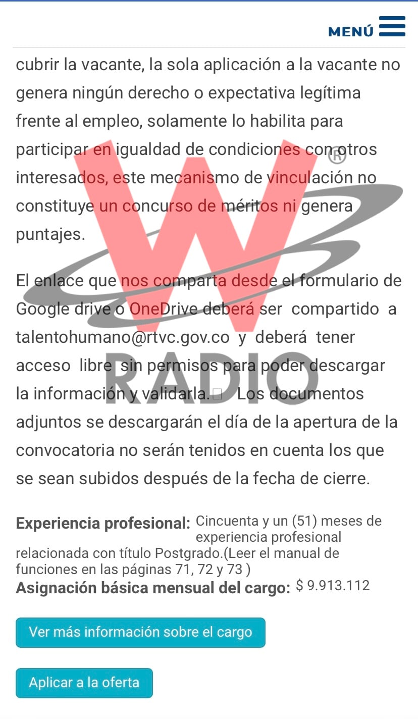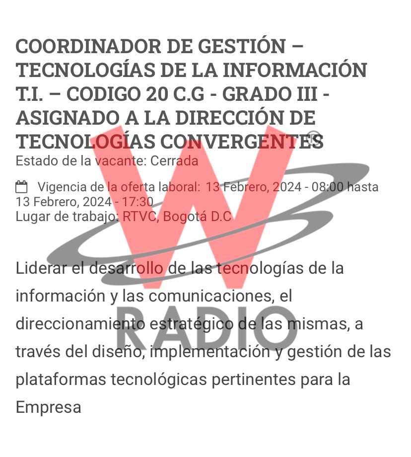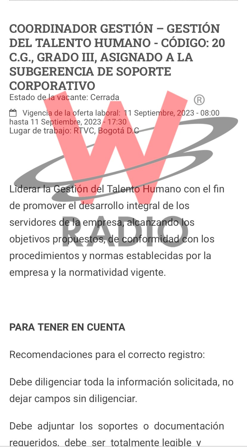 A pesar de que el pasado 19 de marzo, RTVC emitió un comunicado a través del cual señalaba que la contratación de la coordinadora de recursos humanos Yuribeth Reina, cuñada del subgerente de soporte corporativo de la entidad, Jorge Arzuaga, se había realizado tras un “proceso de selección objetivo (...) publicado en la página web de RTVC”, La W estuvo verificando la transparencia de dicho proceso y descubrió un nuevo elemento que genera inquietudes sobre la forma en que se están desarrollando las convocatorias y los procesos de selección para ocupar cargos en los medios públicos.