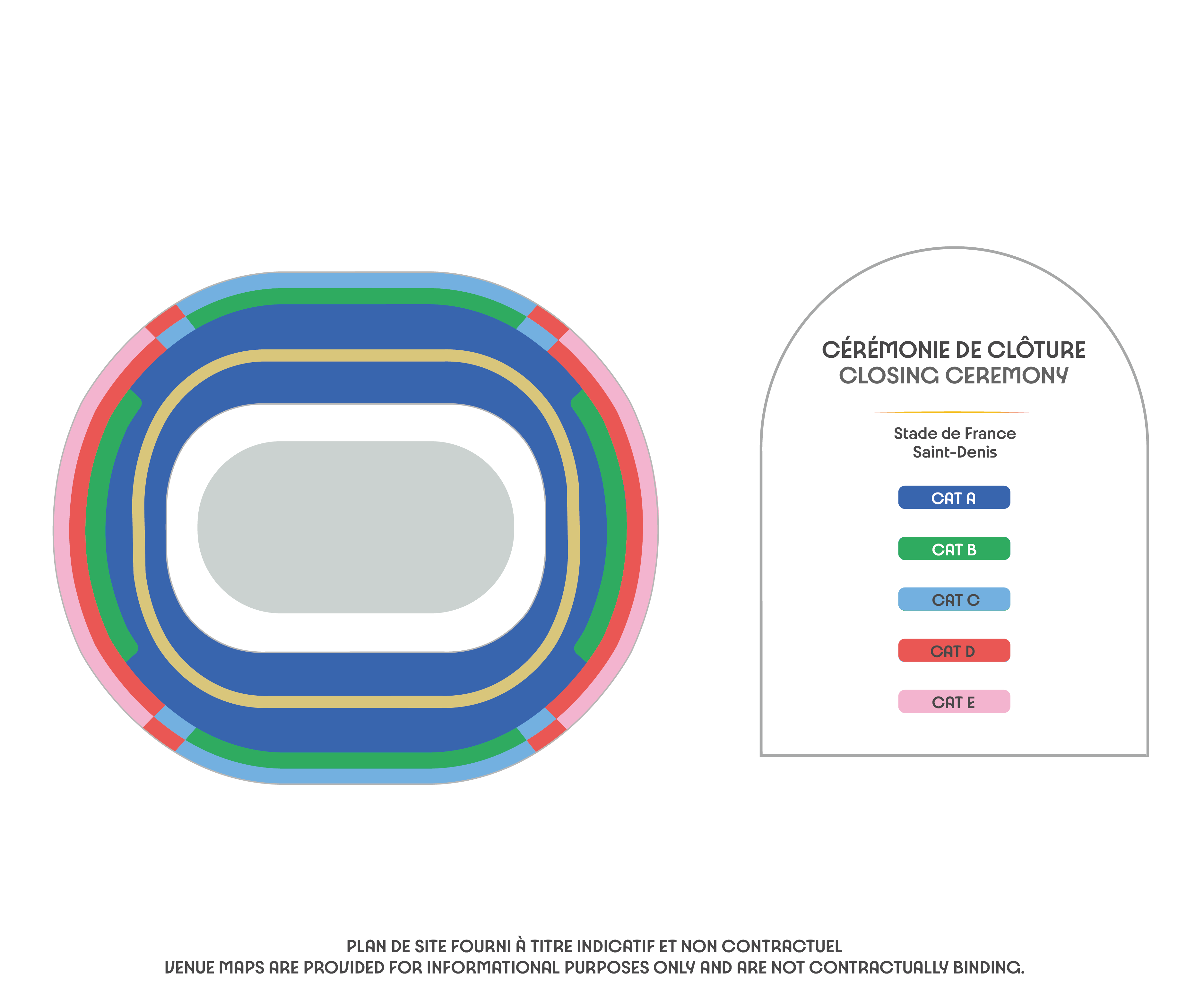 La jornada de apertura tendrá espacios de libre acceso al público. En contraste, la ceremonia de cierre de los Juegos Olímpicos será en el Estadio de Francia en la zona de Saint-Denis entre las 8:00PM y las 11:00PM con estos valores según la ubicación dentro del estadio: