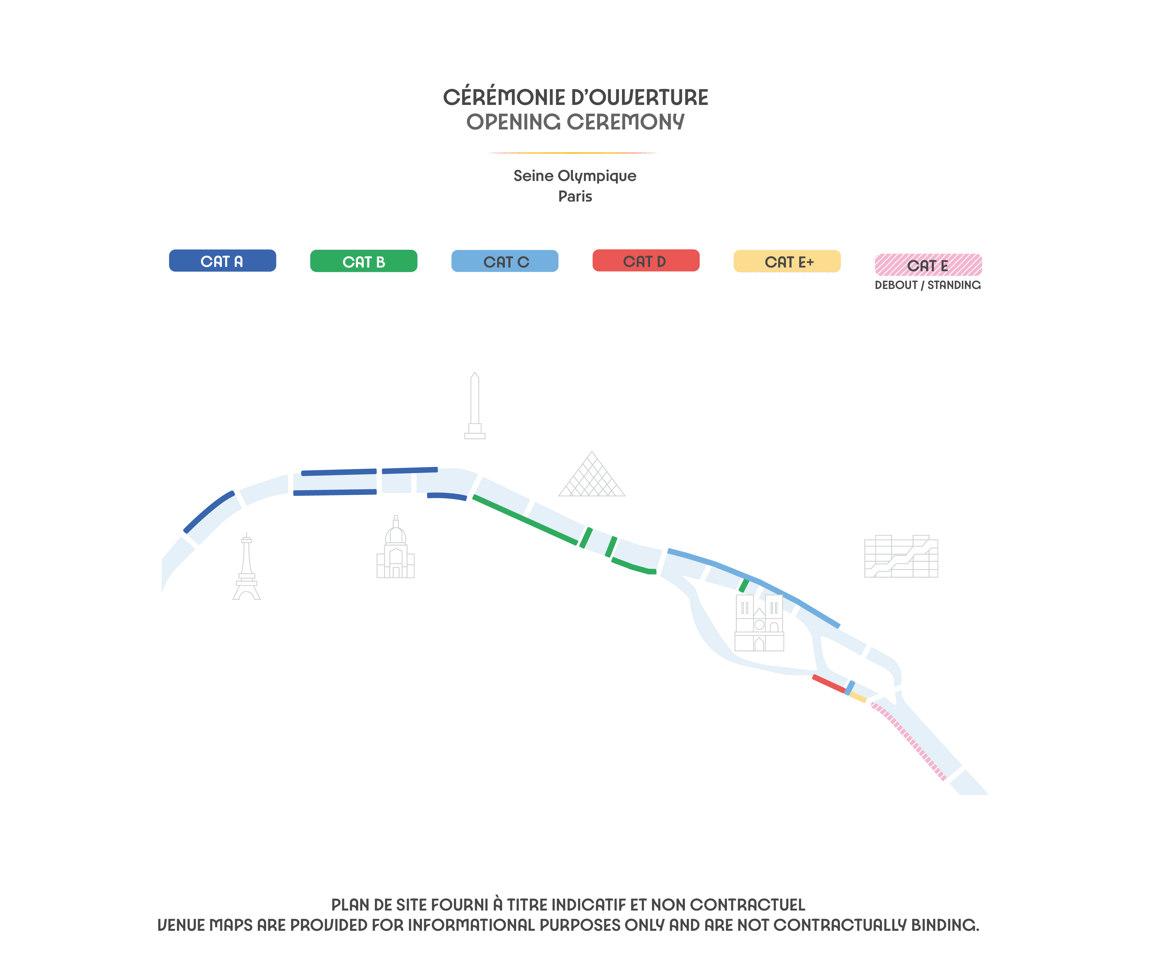 Unas de las entradas más apetecidas son para la inauguración y el cierre de los Juegos Olímpicos. Según la página web oficial de la competencia, el valor de la entrada para la inauguración el 26 de julio (entre las 7:30PM y las 11:15PM) se divide en 6 categorías según la ubicación, si es de pié o sentado y el lugar en el que se verá la apertura junto al río Sena: