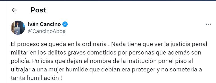 “El proceso se queda en la ordinaria . Nada tiene que ver la justicia penal militar en los delitos graves cometidos por personas que además son policía. Policías que dejan el nombre de la institución por el piso al ultrajar a una mujer humilde que debían era proteger y no someterla a tanta humillación!”.
