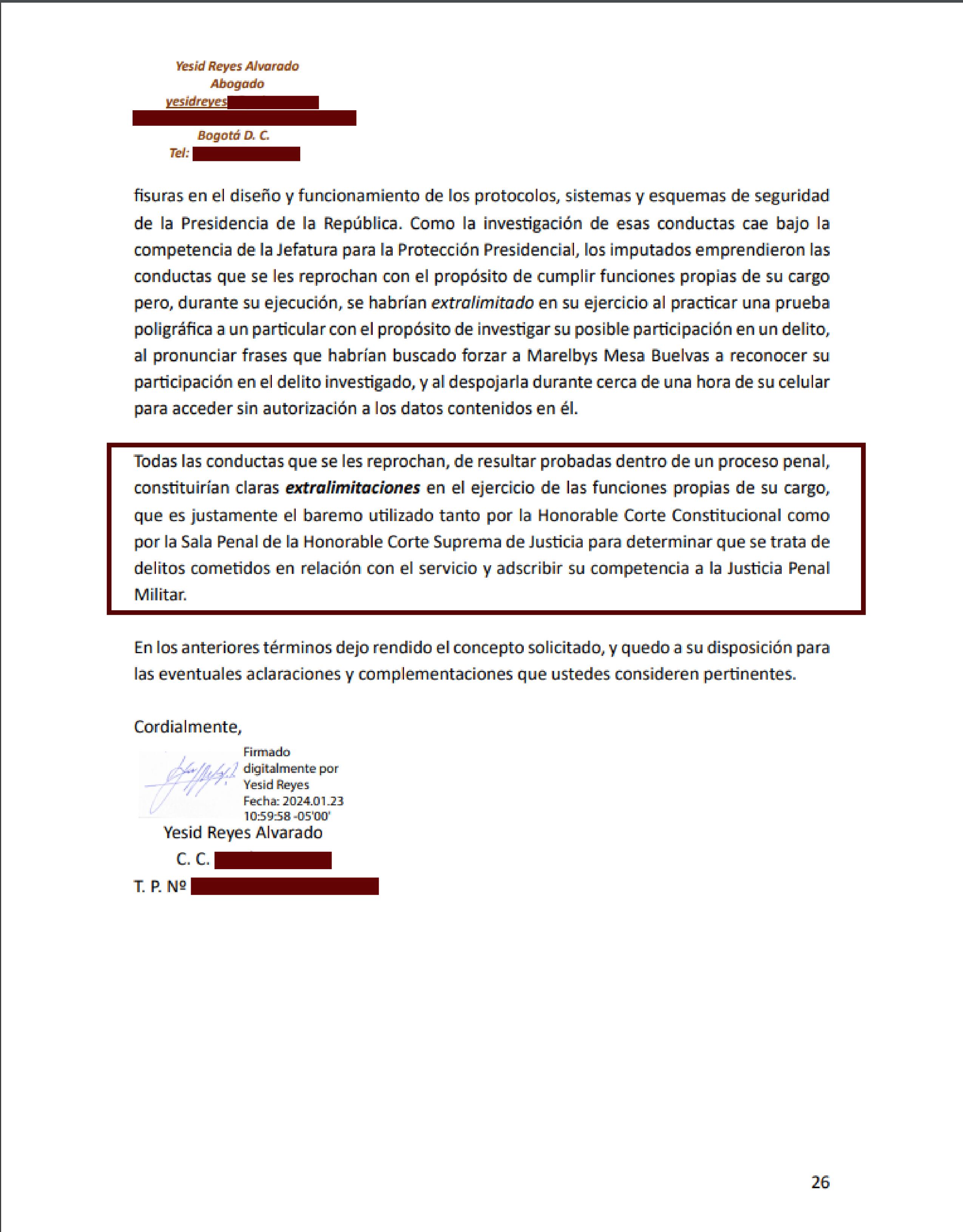 Concepto del ex ministro Yesid Reyes, sobre el caso del coronel Carlos Feria por polígrafo a Marelbys