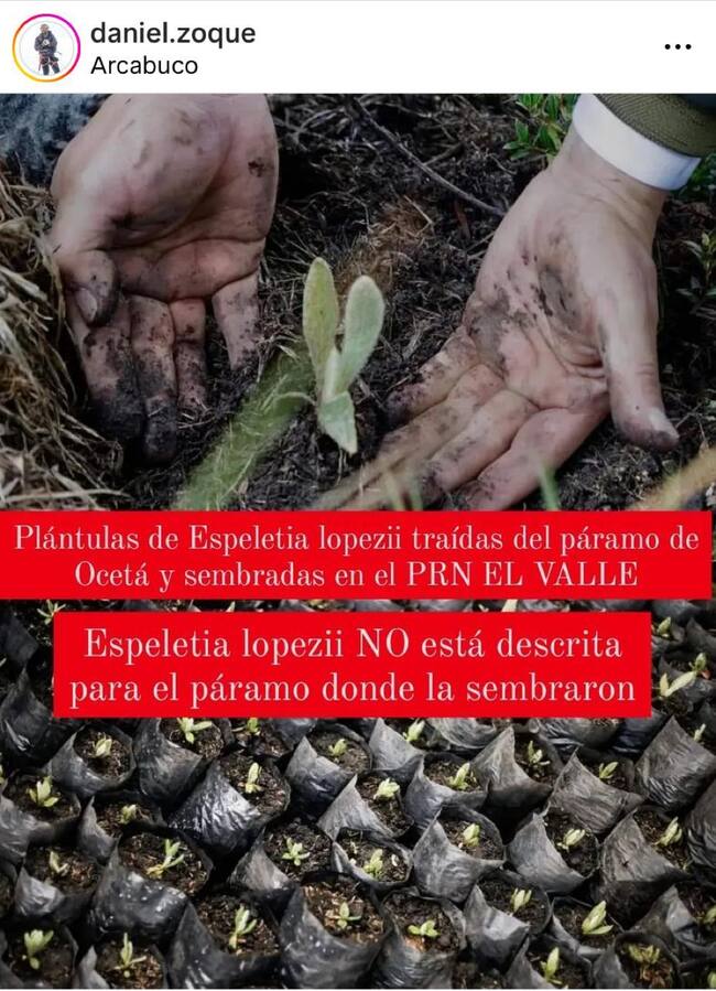 Daniel Camilo Castillo es un reconocido líder ambientalista del departamento de Boyacá y quien recorre permanentemente las montañas y, en entrevista con Caracol Radio se refirió a las plántulas de frailejones que fueron trasladadas del vivero de alta montaña del señor Moisés Moreno del municipio de Monguí al Parque Natural Regional El Valle en Arcabuco, en la semana ambiental en junio de 2023 organizada en ese entonces por la administración del entonces gobernador Ramiro Barragán. “Las plantas murieron porque sencillamente no pertenecen a ese páramo en las cuales fueron sembradas. La molestia es porque se están llevando plantas de un páramo a otro incluso a otros paramos del país”, se quejó. E hizo una advertencia, “hay que ponerle fin a eso, el daño que le están haciendo a los demás paramos es muy grande, aparte de que están perdiendo todo el trabajo que han desarrollado en el vivero porque son plantas que duran prácticamente dos años germinando, no están haciendo un trabajo éticamente responsable con el medio ambiente”, dijo.