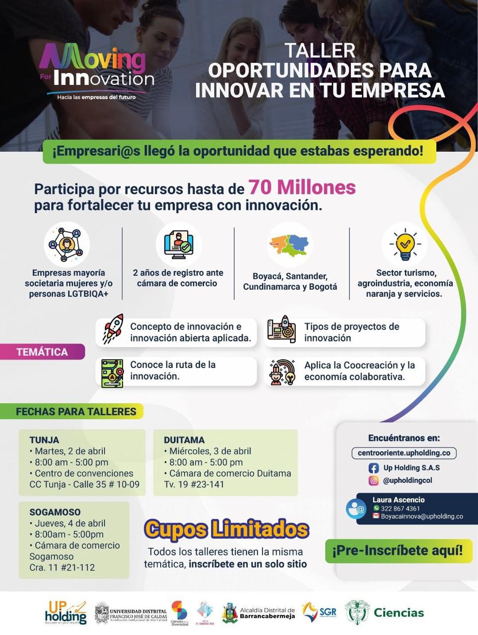 Mujeres y emprendedores de la población LGBTIQA+ del departamento de Boyacá, podrán recibir hasta $ 70 millones para su empresa, si está dentro del sector turístico, agroindustrial, economía naranja o de servicios, gracias al proyecto Moving for innovation, el cual busca promover el enfoque de género y la diversidad sexual en los departamentos de Boyacá, Cundinamarca, Santander y la ciudad de Bogotá.