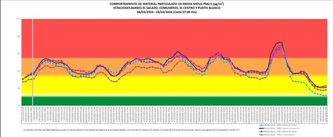 Desde esa fecha, se han desarrollado diferentes entornos para la atención y toma de decisiones para superar esta contingencia, logrando que este 28 de marzo, con corte de las 7 de la mañana, se obtenga una tendencia a la baja y a la espera de la estabilización de los niveles de concentración a los que se venían manejando en la ciudad de Cúcuta desde que entraron en operación los nuevos equipos automáticos del SVCA.