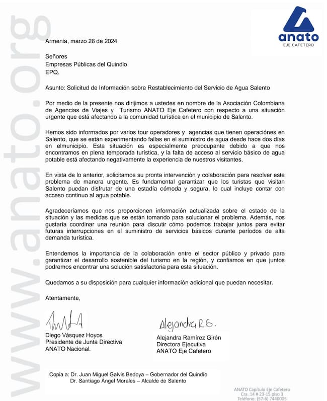 Señaló que se pone en riesgo la reputación del destino que durante esta temporada vive una alta demanda de servicios y experiencias en Salento. Llamó la atención para que las autoridades locales junto con la empresa prestadora del servicio público establezcan los planes de contingencia y permita subsanar cualquier eventualidad sin poner en jaque a los empresarios turísticos.