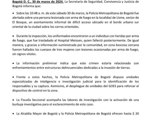 Eran las 10:30 de la mañana del sábado 30 de marzo, cuando la policía fue avisada por parte de los habitantes de un sector rural en la localidad de Usme, en el sur de Bogotá, porque escucharon disparos y todo indicaba que había personas muertas. En ese momento no se sabía la gravedad de lo que estaba ocurriendo.