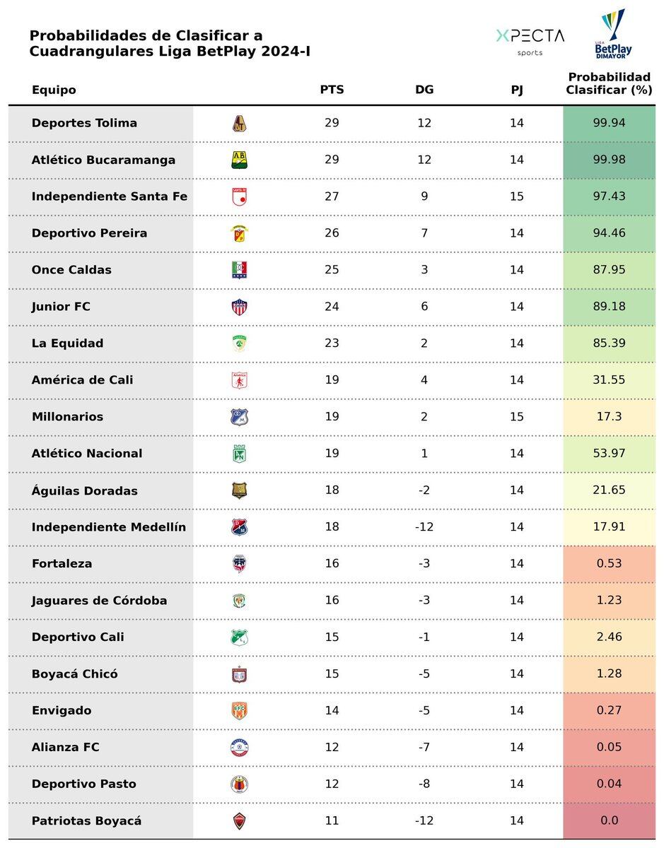 Después de Tolima y Bucaramanga, instalados en cuadrangulares con más de 99% de probabilidad de clasificar, aparece Independiente Santa Fe con el 97.43 y por la misma línea está Deportivo Pereira (94.46). Abajo del umbral de los 90, se encuentra Junior con el 89.18% y el sexto clasificado sería Once Caldas con 87.95.