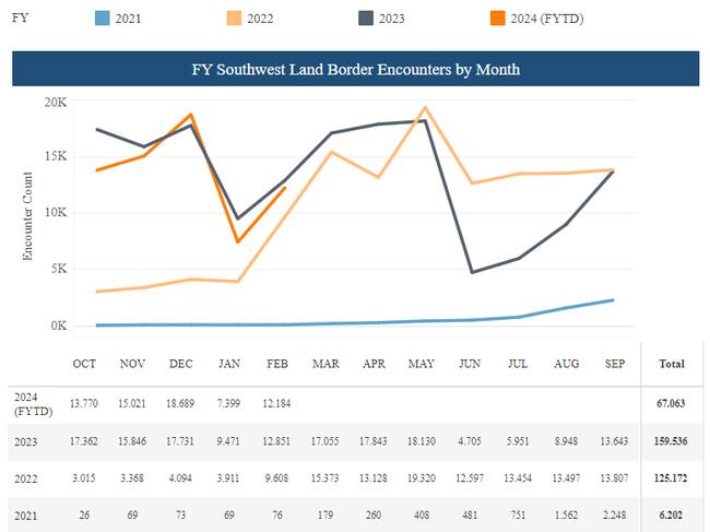 Se destaca que durante el año fiscal (AF) 2023 (desde octubre de 2022 hasta septiembre de 2023) se registró la detención de 159.536 colombianos en la frontera sur y en lo que va de este año fiscal (octubre de 2023 a febrero de 2024) se han detenido 67.063 colombianos, esto implica que en 5 meses del AF2024 se ha detenido casi la mitad de colombianos (42%) que en todo el AF2023.