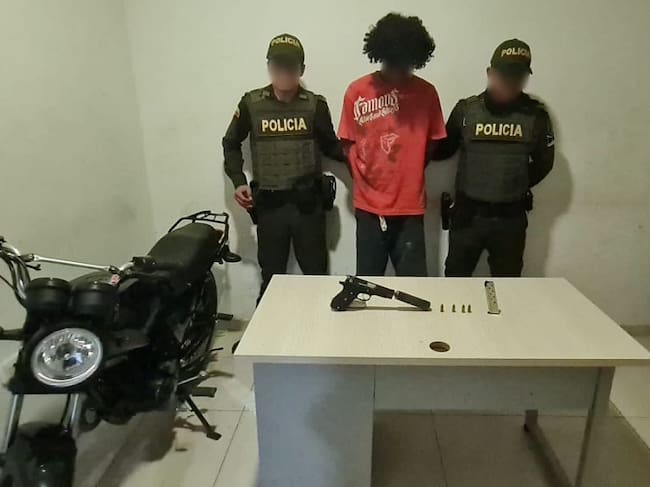 Durante operativos de registro y control con integrantes del ‘Grupo Élite’, en la calle El Bolsillo del barrio La Maria, límites con el sector de La Perimetral, fue capturado ‘el Bebé’, quien se movilizaba en una motocicleta marca AKT de placas RMY-16C, portando una pistola 9 milímetros, con un cargador, un supresor de sonido y cuatro cartuchos sin percutir.