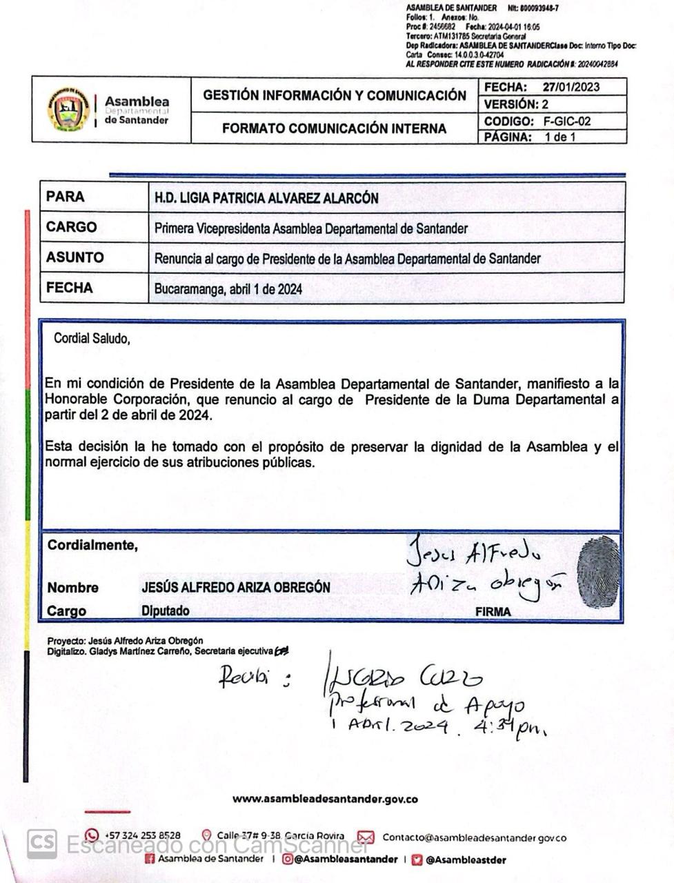 Finalmente, el diputado Ariza presentó hoy 1 de abril del 2024, su carta de renuncia dirigida a la vicepresidenta de la Asamblea, Ligia Patricia Álvarez Alarcón.