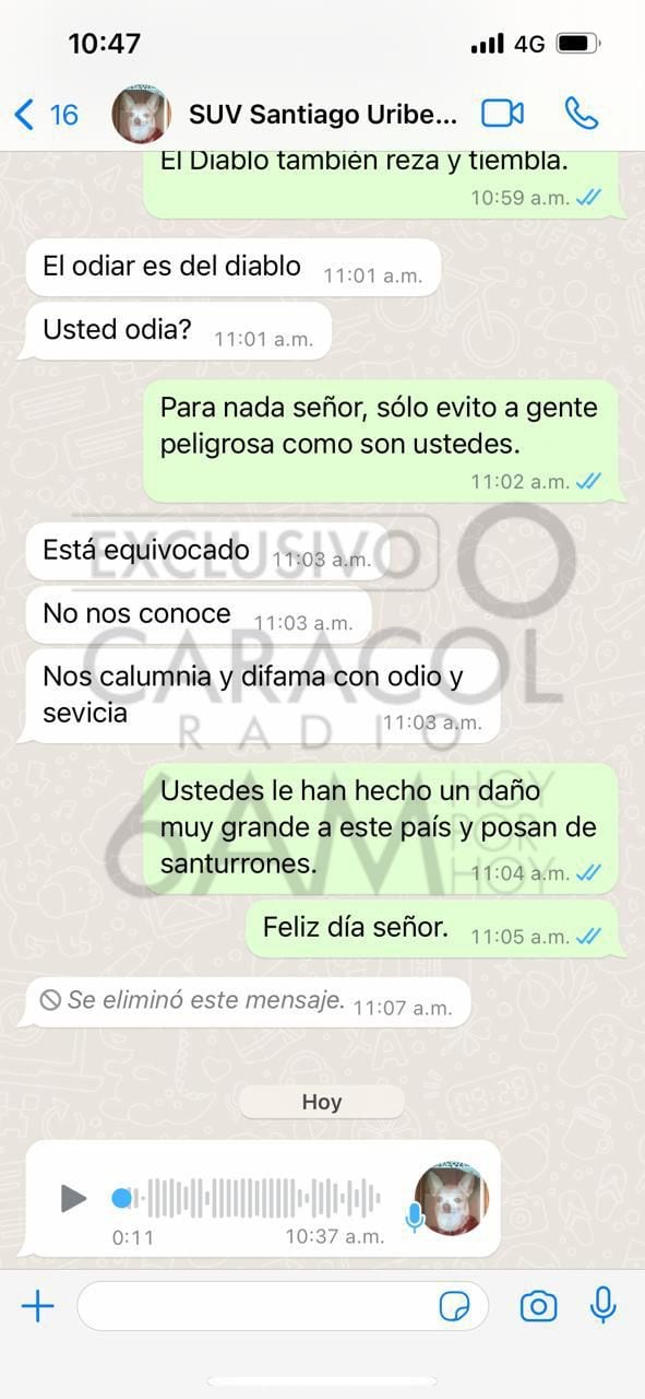 El periodista recibió un audio de Santiago Uribe, en el que habría una amenaza contra su vida.