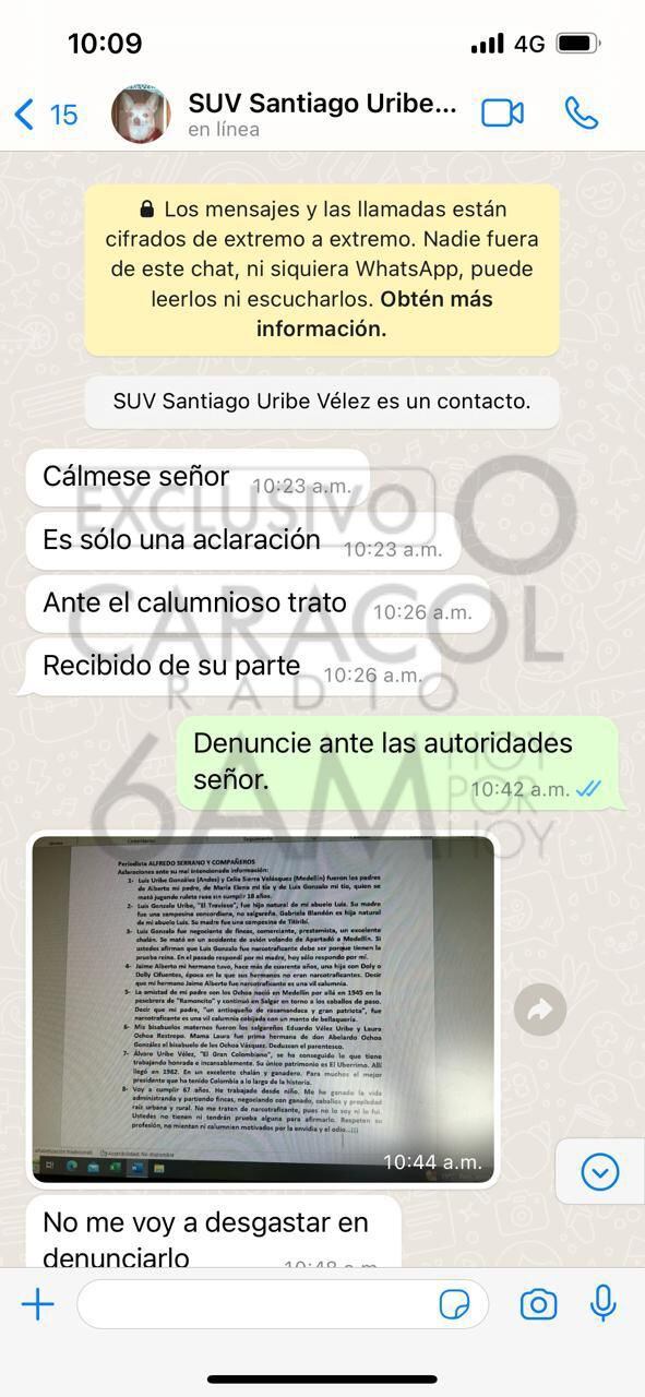 Jorge Espinosa pudo establecer que ese número de celular, sí pertenece a Santiago Uribe Vélez. Por lo cual, el periodista Serrano ya dio aviso a las autoridades, y puso la denuncia por lo que él considera que es una amenaza contra su vida.