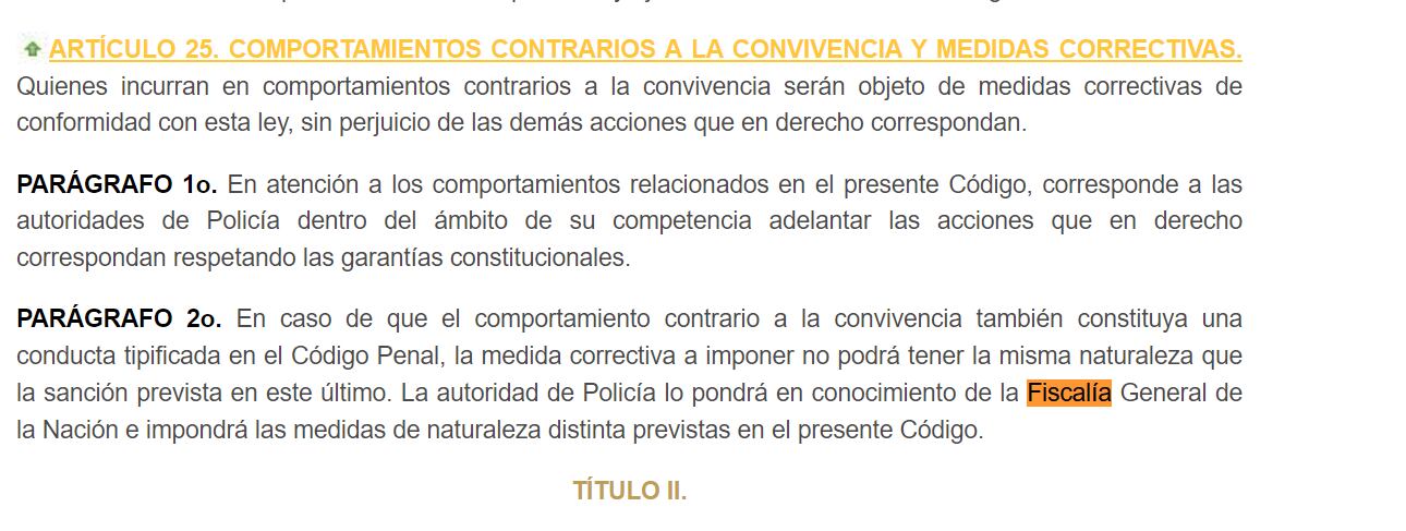 Uno de los argumentos de análisis en la Fiscalía, es que en el Código Nacional de Seguridad y Convivencia Ciudadana, (o código de policía) el artículo 25 establece que: