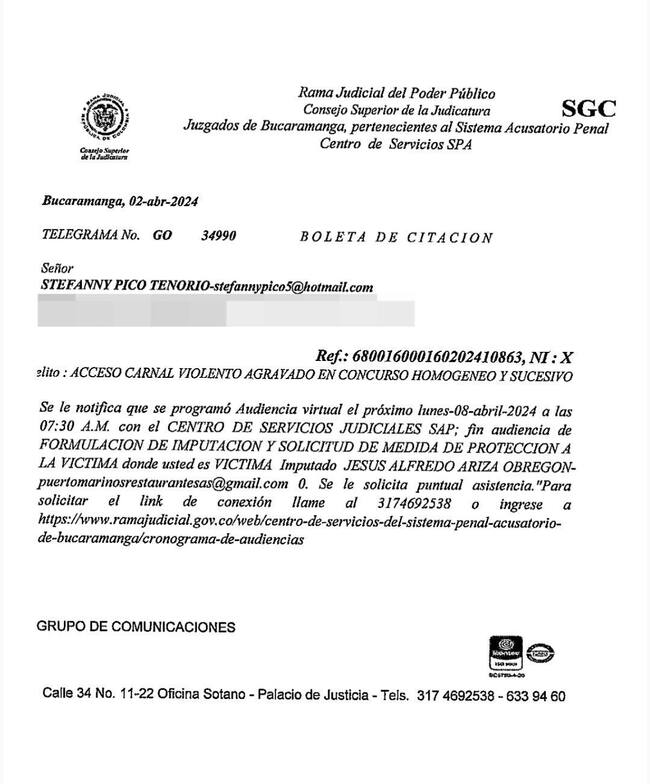 En las últimas horas, el centro de servicios judiciales citó a Ariza para la imputación de cargos por el delito de acceso carnal violento hacia su expareja sentimental. Se tiene previsto que la Fiscalía solicite medidas de protección para la víctima.