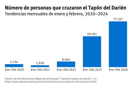 Durante 2023, más de medio millón de personas cruzaron el Tapón del Darién incluyendo 113.000 menores de edad. Según las cifras de cruces entre enero y febrero de cada año, se estima que la tendencia de aumento continuará durante 2024. En esta travesía se identifican principalmente venezolanos, haitianos y ecuatorianos pero también se encuentran personas de Asia y África.