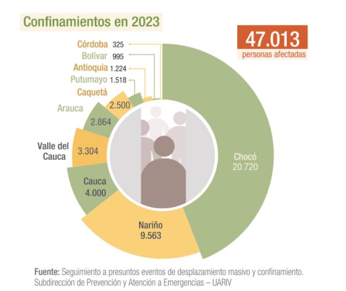 Las disputas territoriales entre actores armados y la presencia de artefactos explosivos llevaron al confinamiento de 47.013 personas, lo que representó un aumento del 19 % a nivel nacional, comparado con 2022. La situación continúa siendo crítica en Chocó, departamento en el que se concentró el 44 % de la población confinada.