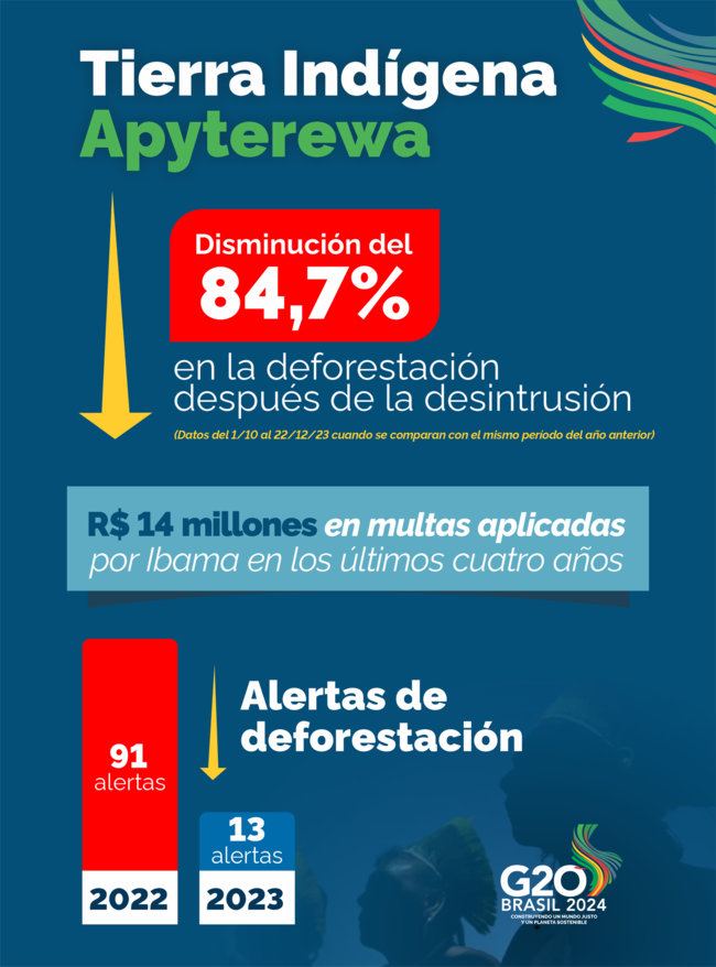 El Gobierno del Brasil, para cumplir la orden judicial que determinó la ‘desintrusión’, montó una gran operación, con acción integrada de 19 órganos e instituciones públicas, entre ellas fuerzas de seguridad y órganos de fiscalización nacionales. Con la operación de ‘desintrusión’, la deforestación en la Tierra Apyterewa presentó una disminución del 84.7% en el período del 1º de octubre al 22 de diciembre de 2023, cuando es comparado al mismo ciclo del 2022, de acuerdo con datos del sistema Deter del INPE. Fiscalizaciones del IBAMA resultaron en la aplicación de más de 14 millones de reales en multas en los últimos cuatro años.