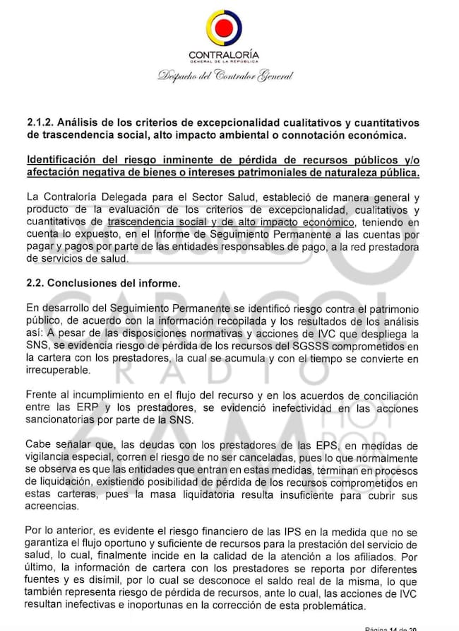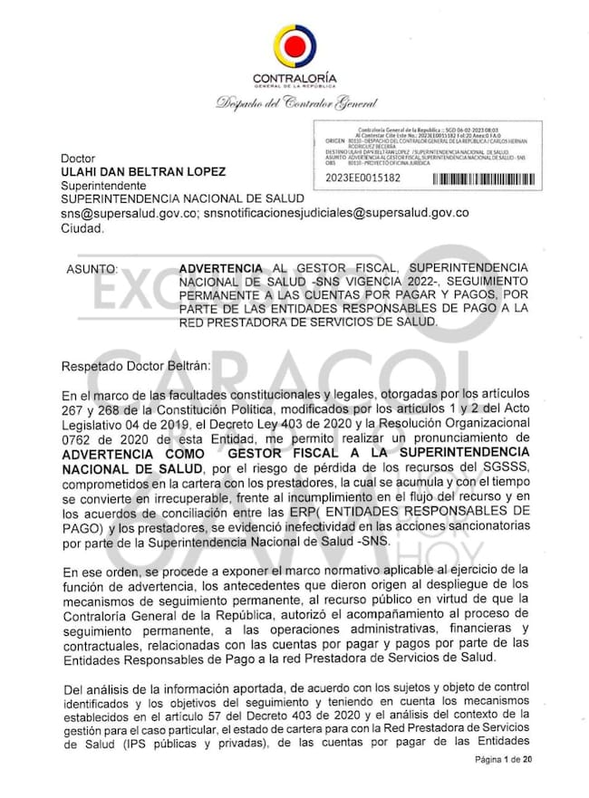 El documento de 20 páginas conocido por Caracol Radio, se envió en su momento al Superintendente de Salud, Ulahi Dan Beltran, con copia al presidente, Gustavo Petro, con una Función de Advertencia por las irregularidades en las acciones de vigilancia y control de la entidad y advierte sobre la inminente pérdida de recursos públicos del Sistema de Salud, entre otros, debido a la deficiente gestión que se realiza en las EPS que están vigiladas, intervenidas o en liquidación.