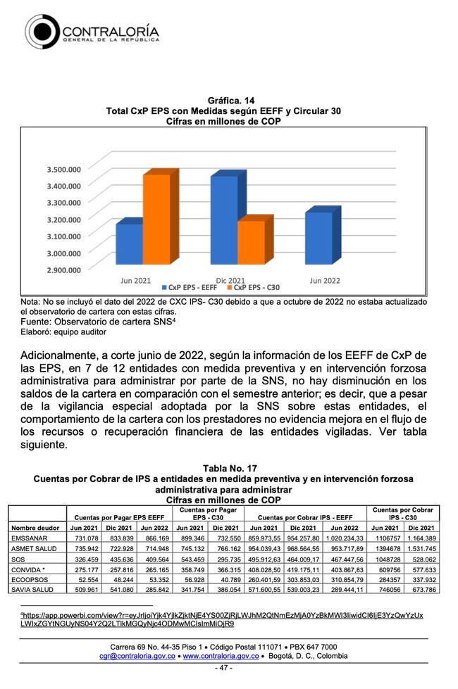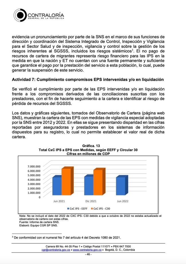 En el documento se advierte que dadas las deficiencias observadas en el seguimiento permanente y la auditoría de cumplimiento a la Supersalud, se considera que hay inefectividad en las acciones sancionatorias y en las medidas de inspección vigilancia y control para que las EPS, incluso las que están en intervención, cumplan con las normas vigentes y saneen sus carteras, “lo que perpetúa el problema en el tiempo y genera desgaste administrativo sin una solución clara a la vista”.