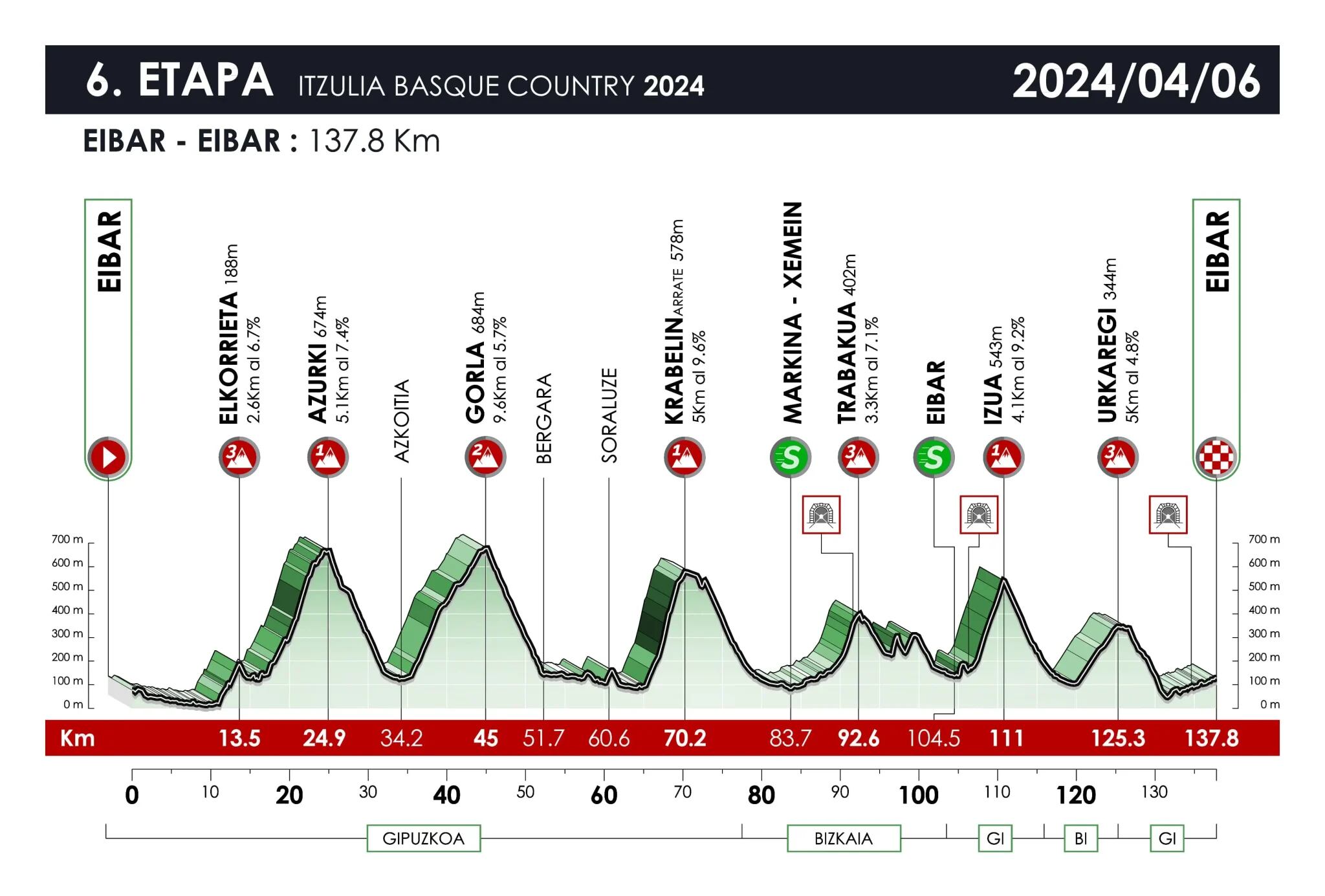 El sábado 6 de abril se correrá la etapa reina de la Vuelta al País Vasco, que saldrá y llegará en Eibar. En esta etapa los ciclistas tendrán que recorrer una distancia de 137,8 kilómetros, con siete puertos de montaña, tres puertos de tercera categoría, uno en segunda y tres de primera categoría, además de dos esprints, un recorrido que podría modificar la clasificación general y definir el campeón de la versión 2024.