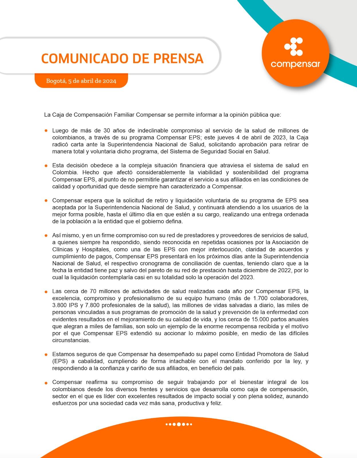 No obstante, el director general de Compensar expresó preocupación sobre la situación del sistema de salud en el país. Resaltó que la decisión es una medida frente a lo que vive Colombia. Del mismo modo, indicó que es una decisión que está basada en su responsabilidad como entidad prestadora de servicios de salud, pero que pese a que han buscado la manera de estar al día en sus responsabilidades financieras, no ha sido sencillo.