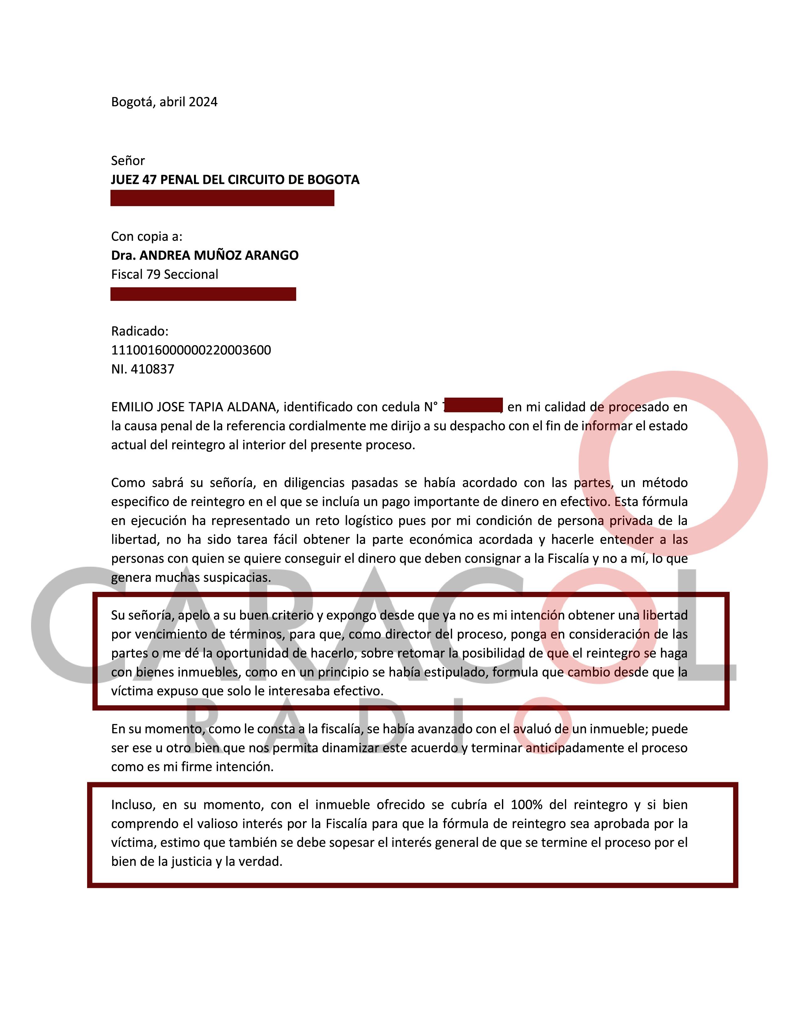 Caracol Radio conoció que esta semana Emilio Tapia le envió un escrito de dos páginas al juez 47 de Conocimiento de Bogotá en el que pidió más tiempo para cumplir con la promesa de devolver el dinero que él se robó.