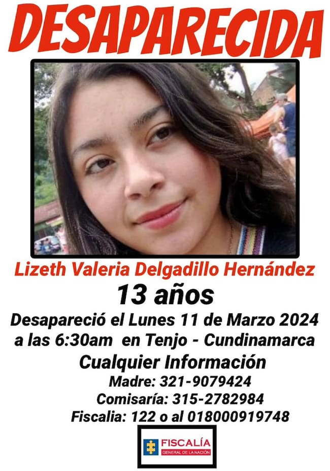 Lizeth Valeria Delgadillo de 13 años desapareció el pasado 11 de marzo en el municipio de Tenjo, Cundinamarca.