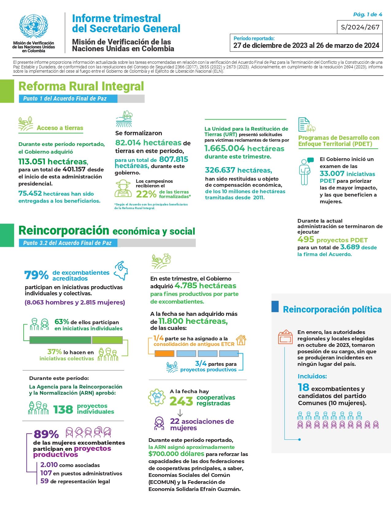 En el informe trimestral sobre la Misión de Verificación de la ONU en Colombia se recuerda que sigue pendiente la aprobación de decretos claves para el proceso, como el que formaliza el Programa de Reincorporación Integral, el que establece el Sistema Nacional de Reincorporación y el que se relaciona con las áreas especiales de reincorporación colectiva.