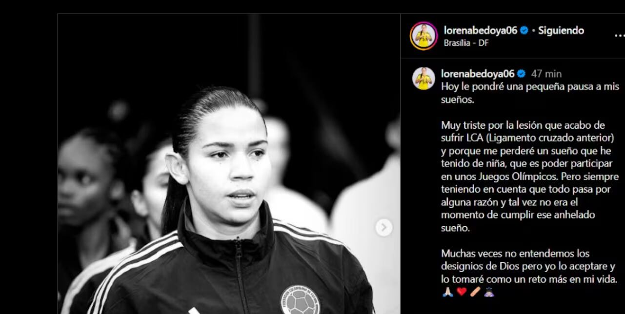 Sin embargo, las buenas noticias pararon cuando este sábado se confirmó que Lorena Bedoya, mediocampista de 26 años, que pertenece al Real Brasilia del fútbol brasileño. No podrá hacer parte de la convocatoria final para las justas, por una ruptura de ligamento cruzado en una de sus rodillas, lesión que supone más de 8 menes de recuperación. Ella misma fue la encargada de dar la noticia a través de su cuenta oficial de Instagram.