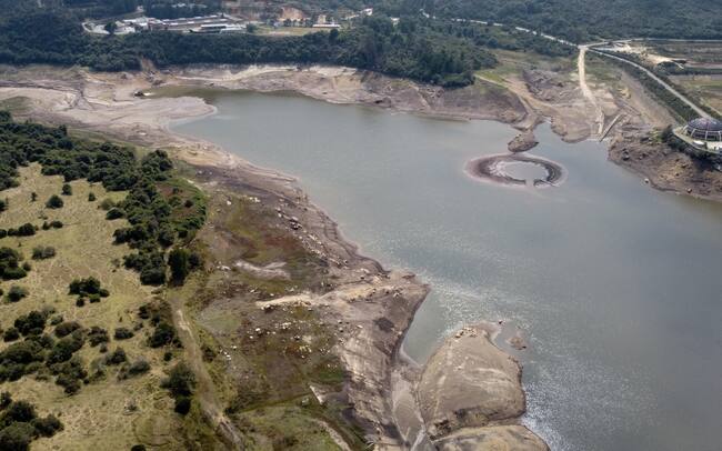 LA CALERA, COLOMBIA - MARCH 8: A top view shows drought in reservoirs and skyrocketing consumption are behind the water supply alert at the San Rafael Reservoir in La Calera, Cundinamarca, Colombia on March 8, 2024. The El Nino phenomenon generates various consequences that require carrying out multiple risk management and administration tasks derived from the climatic phenomenon. Since the beginning of the year, the filling level of the reservoirs from which the water comes, is not only in Bogota but also in several departments of Colombia. (Photo by Juancho Torres/Anadolu via Getty Images) / Anadolu