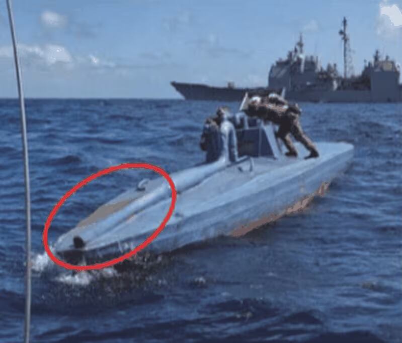 Sumergible colombiano incautado cerca a Puerto Rico. Imagen de la Fuerza de Ataque del Corredor del Caribe de la Fuerza de Tarea de Control de Drogas contra el Crimen Organizado (OCDETF).