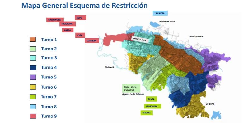 El primer turno de restricción afectará a 10 localidades con 286 barrios, incluyendo Antonio Nariño (23 barrios), Barrios Unidos (53), Chapinero (18), Los Mártires (22), Puente Aranda (69), Rafael Uribe Uribe (28), Santa Fe (1), Teusaquillo (52), Tunjuelito (4) y Usaquén (16).