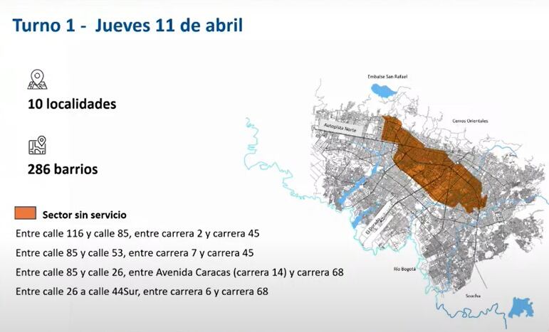 Entre calle 170 y 245, entre carrera 7 y 52; Entre calle 235 y 242, entre carrera 45 y 107. Además, será en los municipios de Gachancipá y ESP Acuopolis; Puntos de suministro a Chía, Cajicá, Cojardín, Sopó, Tocancipá.