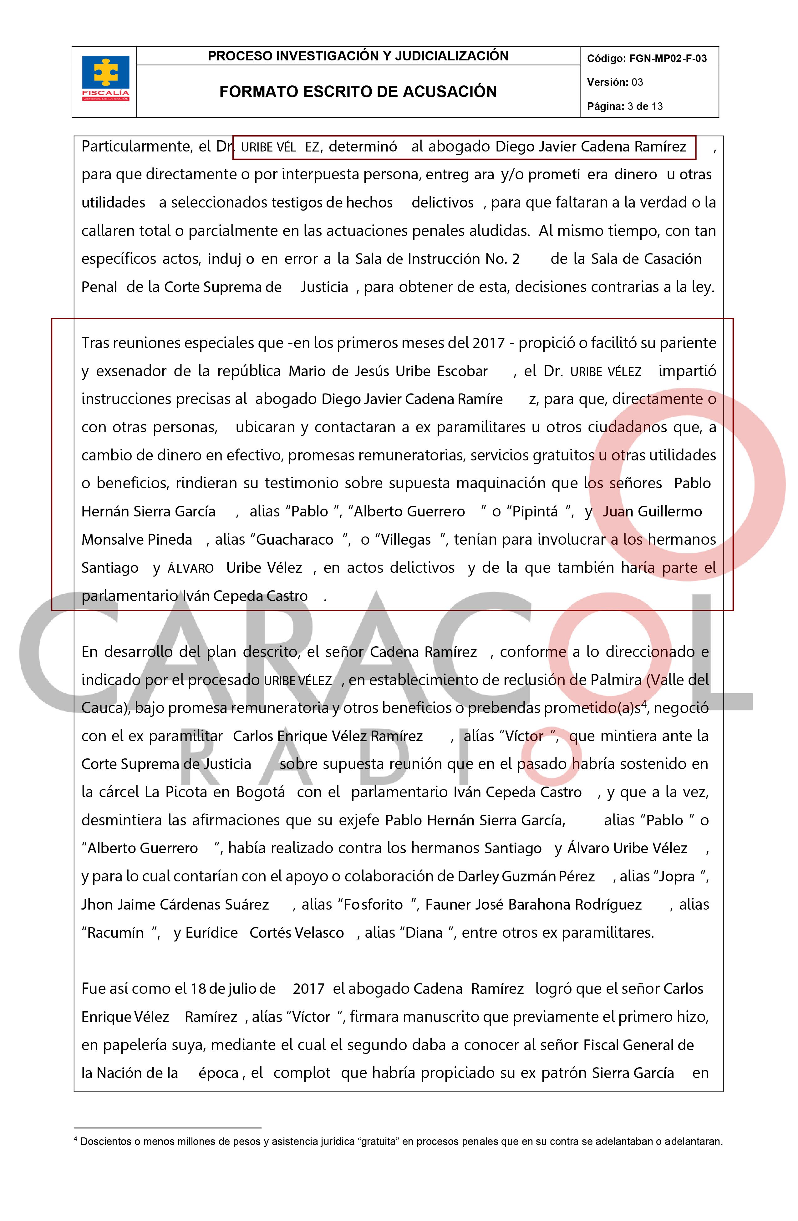 “Adicionalmente, Diego Javier Cadena Ramírez, en nombre y representación del doctor Álvaro Uribe Vélez, con la colaboración de otras personas, en diferentes establecimientos carcelarios y fuera de ellos, ubicó y contactó a ex militantes de grupos de paramilitares, para que, a cambio de favores jurídicos, dinero u otras dádivas, elaboraran escritos y videos a favor del dr. álvaro y de su hermano Santiago, y con los que pretendía tachar de mentirosos a quienes como Pablo Hernán Sierra García o Juan Guillermo Monsalve Pineda habían expresado vínculos o relaciones estrechas de los hermanos Uribe Vélez con grupos paramilitares que operaron en el Departamento de Antioquia, o en zonas circunvecinas”