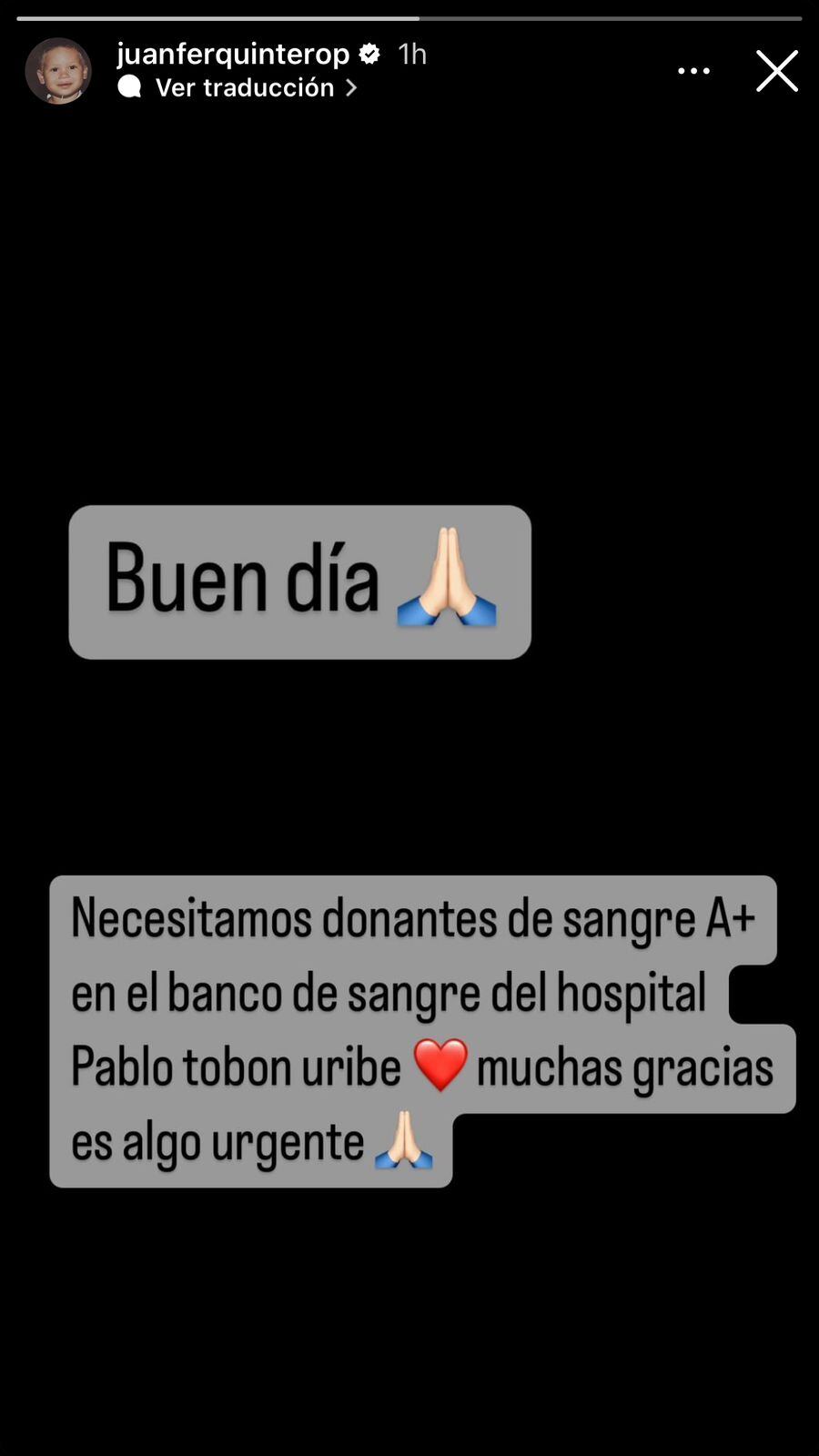 Quintero ya se encuentra en Colombia y por medio de su cuenta de Instagram publicó una historia en la cual solicita donantes de sangre para el hospital Pablo Tobón Uribe de Medellín. “Necesitamos donantes de sangre A+ en el banco de sangre del hospital Pablo Tobón Uribe, Muchas gracias, es algo urgente”.